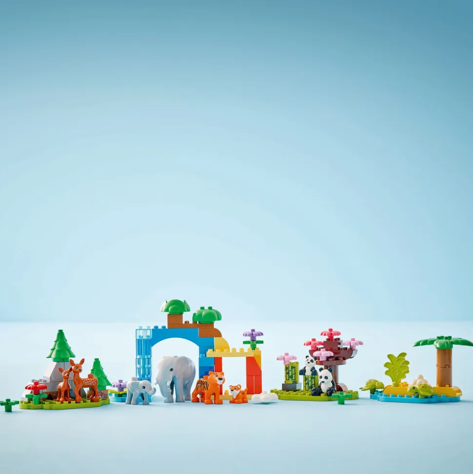 - Fantasivekkende leke med ti ville LEGO® DUPLO® dyr som kan brukes i kreative historier – inkluderer figurer av tiger, elefant, rådyr og panda, hver med sin dyreunge, samt to skilpaddefigurer