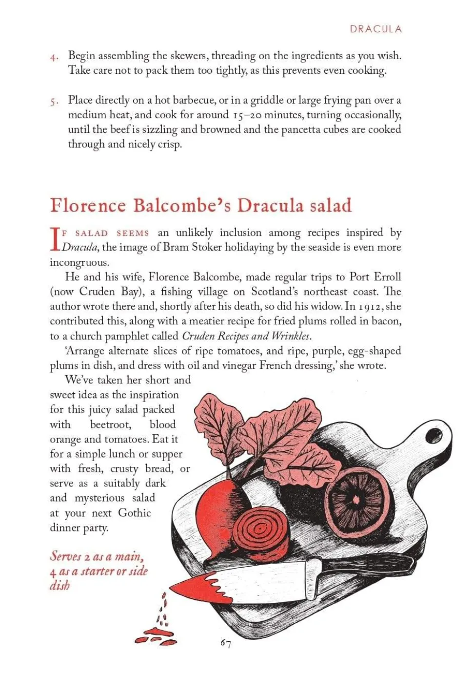 Dracula lulls his victim into a false sense of security with a spicy, smoky, peppery stew, served here with black tagliatelle for full Gothic effect. Frankenstein’s ‘monster’ starts out as a vegetarian who feasts on acorns, which happen to make crumbly, delicately sweetened bread. A sumptuous honeymoon dinner of pheasant with hazelnuts and chocolate signals consumption and indulgence in The Bloody Chamber, while the dripping crumpets and melt-in-the-mouth angel cake from Rebecca are pawns in a battle for control.