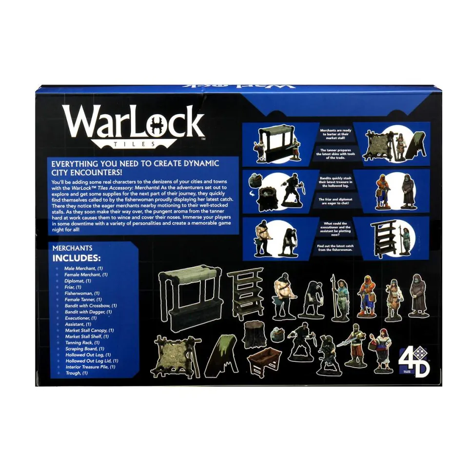 Create an immersive experience for everyone with the WarLock Accessory: Marketplace! With modular options and over 15 pieces, set the scene for the eager buzz of the townspeople heading to market. Set includes: Simple Merchant (Male), Simple Merchant (Female), Skinner/Tanner (Female), Diplomat (Male), Monk/Friar (Male), Fisher (Female), Market Stall Canopy, Market Stall Shelf, Hollowed Out Log, Interior Treasure pile, Hollowed Out Log Lid, Tanning Rack, Scraping Board, Bandit (crossbow), Bandit (dagger), Executioner, Assistant, and a Trough. Contents subject to change.