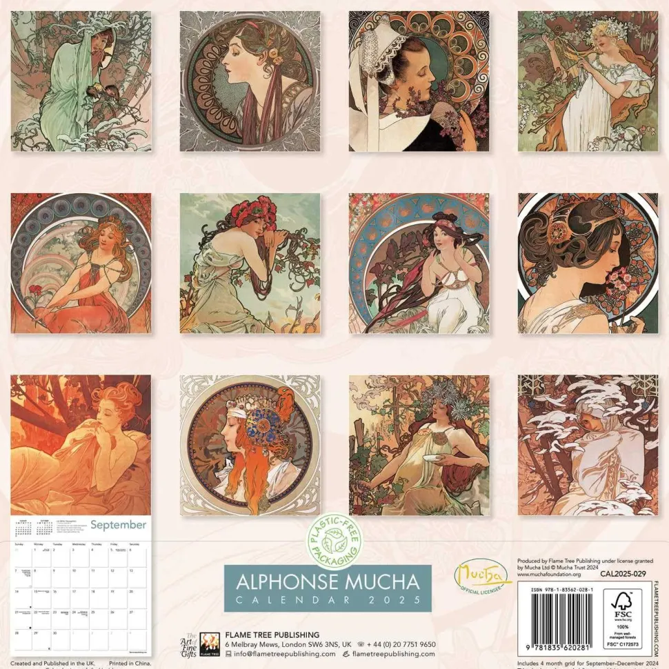 No artist captured the glamour of the fin-de-siècle era as definitively as Alphonse Mucha. Dubbed the ‘father’ of Art Nouveau, this Czech artist transcended the boundaries between commercial and fine art, with his richly decorative images adorning everything from advertising posters to biscuit tins. Composed of ornate, flowing patterns and bold, sensual figures, his highly stylized artwork evoked a spirit of luxury and leisure, and is celebrated in this beautiful wall calendar. Informative text accompanies each work and the datepad features previous and next month’s views. Printed on FSC-certified paper, with plastic-free packaging.