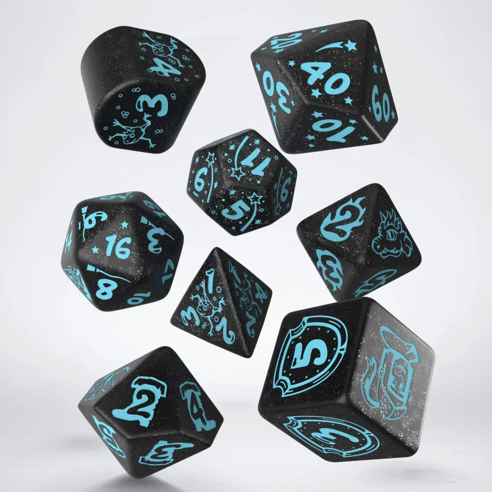 My Very First Set tumbles to the 20th anniversary! Behold the Q WORKSHOP 20 YEARS: My Very First Set, a special limited version of our design for the youngest. Each dice’ engravings are dedicated to a different fairy-tale character. The turquoise paintings on the shimmering-black background infused with glitter dust symbolize two decades of our company’s existence.