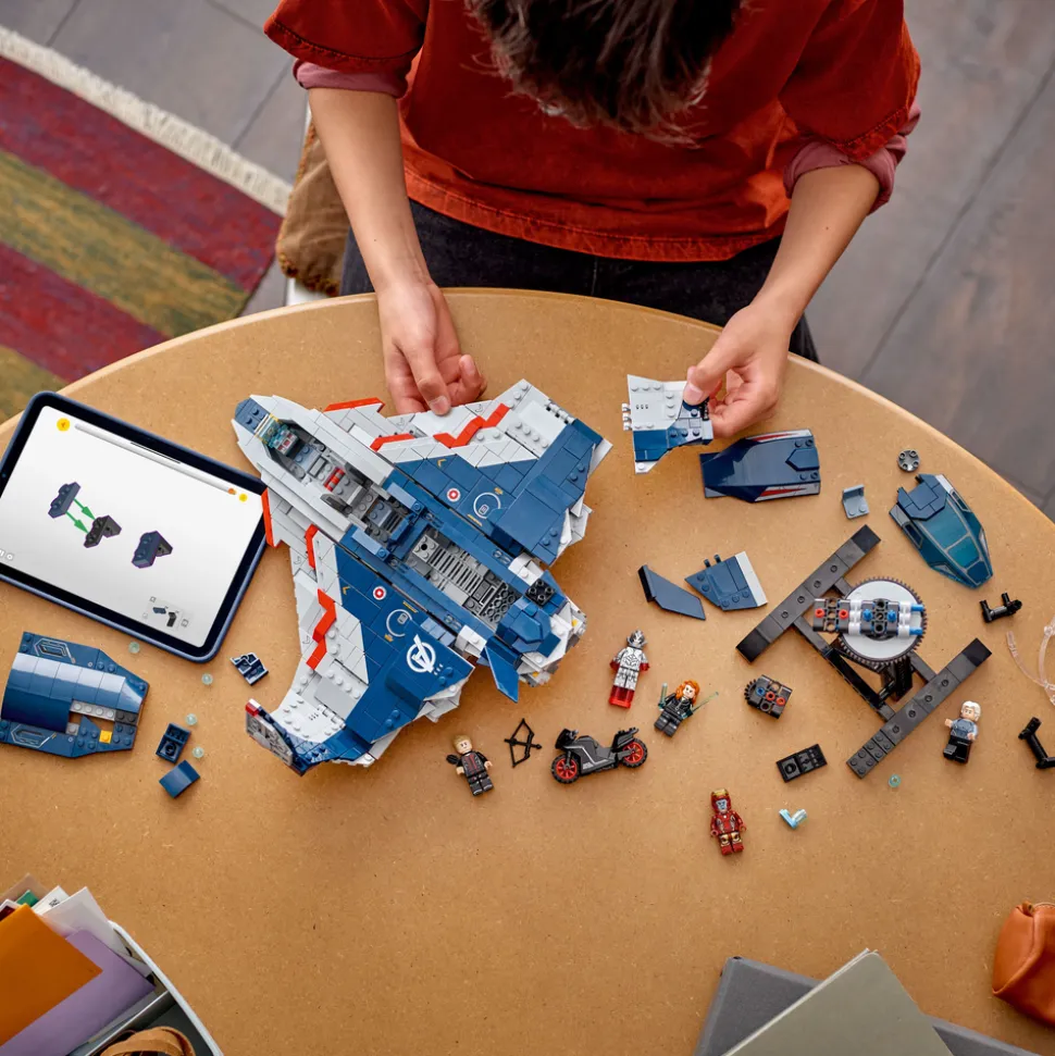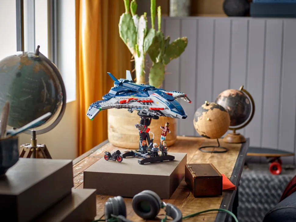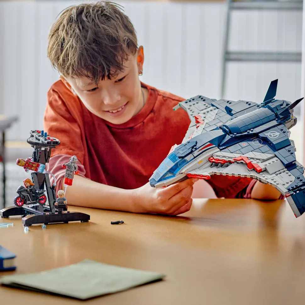 Den byggbare Quinjet-modellen leveres med fem minifigurer: Black Widow med motorsykkelen sin, Iron Man, Quicksilver, Ultimate Ultron og Hawkeye med pil og bue. Minifigurene kan plasseres på flere steder på flyet. Quinjet har et førerhus som kan åpnes, to knotteskytere foran og plass til Black Widows våpen og Hawkeyes bue. Bakdøren kan åpnes, slik at barna kan kjøre motorsykkelen inn og ut. Et avtakbart, roterbart stativ er inkludert for å gi en 360-graders visning av det ikoniske flyet. For ekstra digital moro kan byggere zoome inn, rotere modeller i 3D og spore framdriften deres ved hjelp av den gøyale og intuitive LEGO Builder appen. Inneholder 1131 deler.