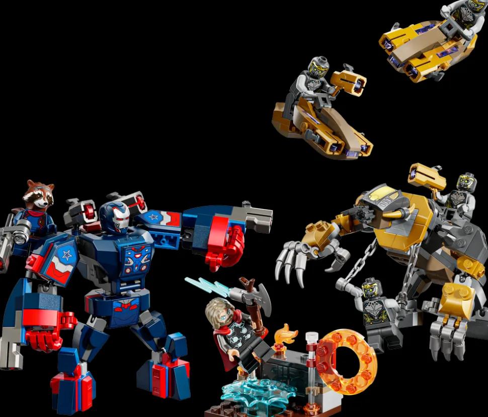 - LEGO® ǀ Marvel minifigurer – Settet inneholder sju minifigurer: Iron Patriot MK2, Rocket med en stor knotteskyter, Thor med Stormbreaker, og fire chitauri, hvorav to har gylne knotteskytere