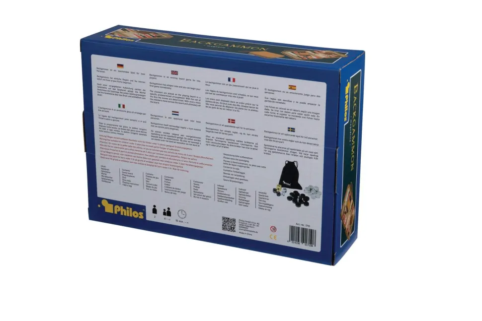 Backgammon is an exciting board game for two people. It has simple rules and you can start your first game immediately.After a given setup, the game pieces are placed on the board. The dice determine the moves. With each move you move your pieces across the board and finally off the board.Experience exciting moments after the dice have been rolled and you then have to make a tactical decision. What will your playing partner roll? Will you take a risk or hedge your bets? Always keep an eye on your opponent’s moves. Every roll brings new momentum and surprises into the game. Even if it looks good for you, you can be thrown out by your playing partner with a stone, which you then have to bring back into play.The winner will be the first to clear his checkers from the board.Content:1 cassette, 1 doubling dice, 2 dice cubs, 4 dice, 15 dark playing pieces, 15 light playing piecesMaterial cassette:MDF, felt inlay, imitation leatherGame size:233 x 170 x 56 mm