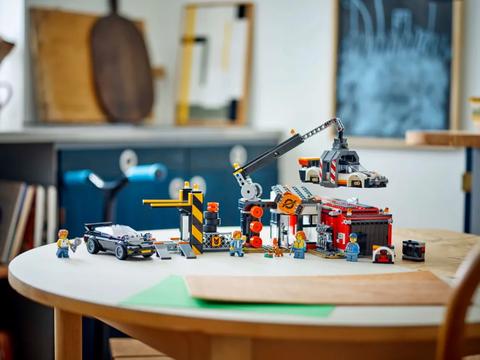- Hva inneholder esken? Dette LEGO® bilopphuggerisettet inkluderer alt barn trenger for å bygge et bilopphuggeri med klokran, knusemaskin, kontorbygning, to biler og fire minifigurer av arbeidere