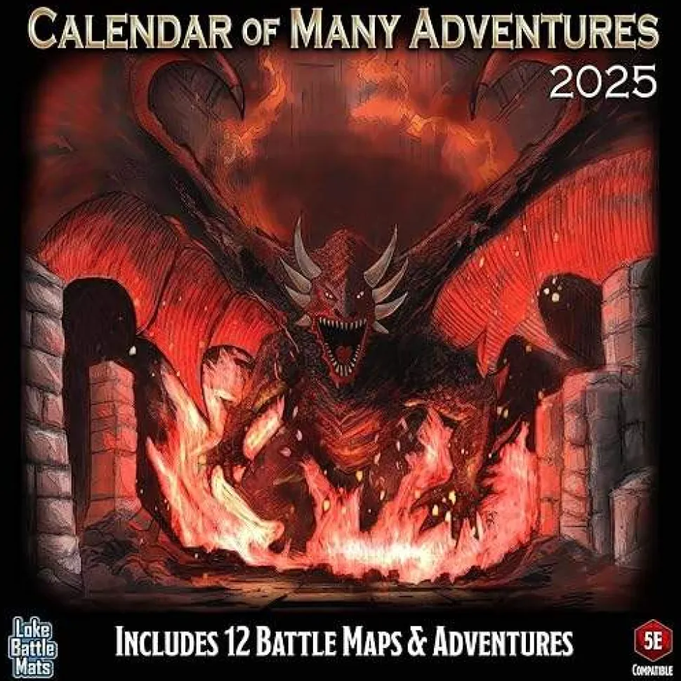A hanging wall calendar with a new battle map for every month and twelve 5E adventures (PDF) to play on them! Enjoy these beautiful maps as art on your wall, along with a handy one month per page 2025 calendar, and then use them on your table as battle maps! As well as inspiring your own encounters there are 12 5E adventures, one for each map, from the Ennie nominated authors at Loke Battle Mats. Measures 12”x12” when closed, 12”x24” when open and printed on glossy paper stock. When open the battle map art is on the top page with the month per page calendar below.