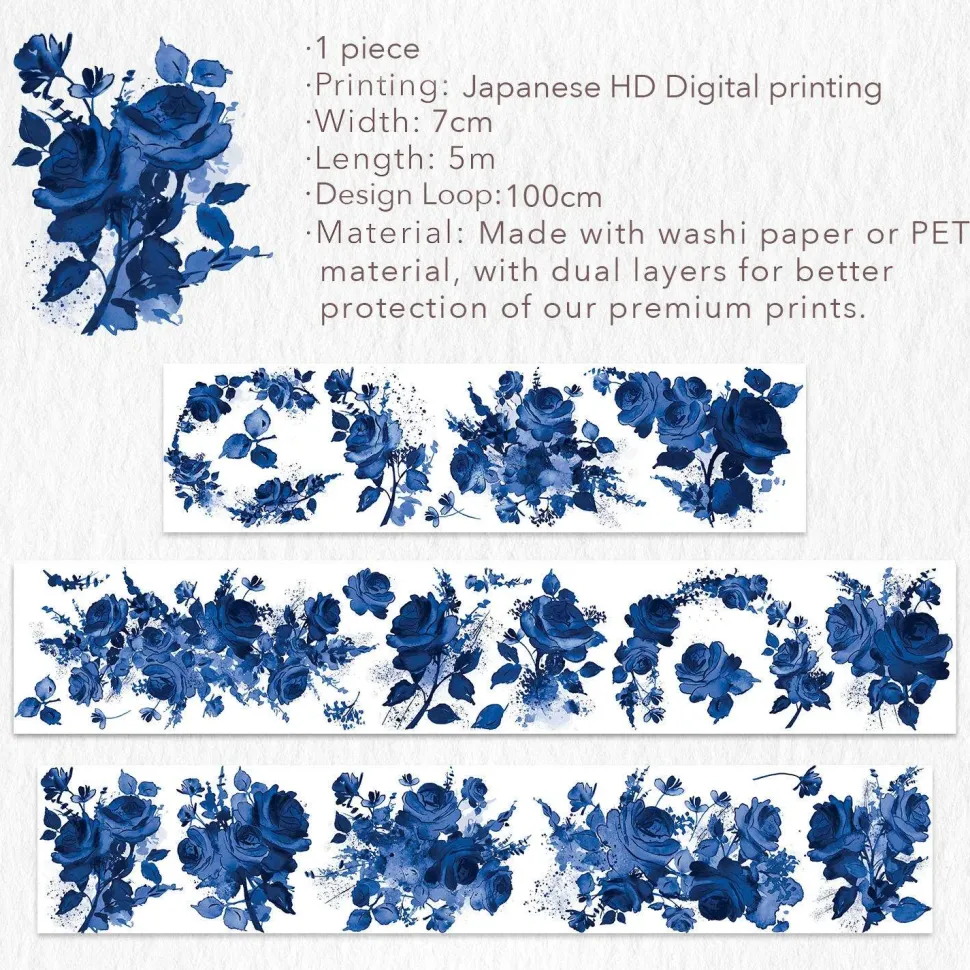 Legg til en dæsj av levende eleganse til livet ditt med denne koboltblå tapen. Se for deg frodige, midnattsblå roser som elegant pryder de listige kreasjonene dine, og gir dem et snev av blomsterteft som er perfekt for enhver anledning.