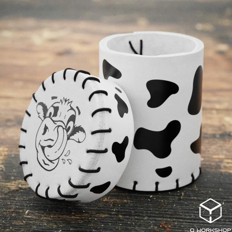 Roll with style, straight from the pasture!The Cow Dice Cup from Q WORKSHOP combines humor, style, and functionality. Made from genuine leather, it features a unique, irregular pattern of black and white cow spots. The lid, hand-stitched with white waxed thread, shows a cheeky cow licking its nose. It’s a perfect cup for those who like to store their dice with character and a touch of rustic charm. No one will ignore this one – guaranteed!