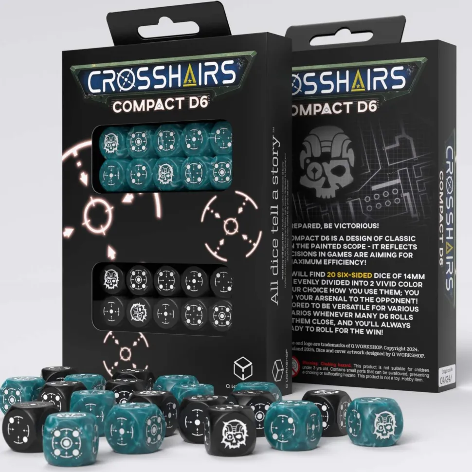 Be always prepared for a game! Here’s something handy: the Crosshairs Compact D6, a pack of 20 dice divided into groups by distinctive background colors: Stormy & Black! The engravings are white on all the D6; they also share the size of 14mm, and their design showcases a crosshair symbol with the dots embedded and a cybernetic skull on the highest face. Keep them close for any gaming occasion!