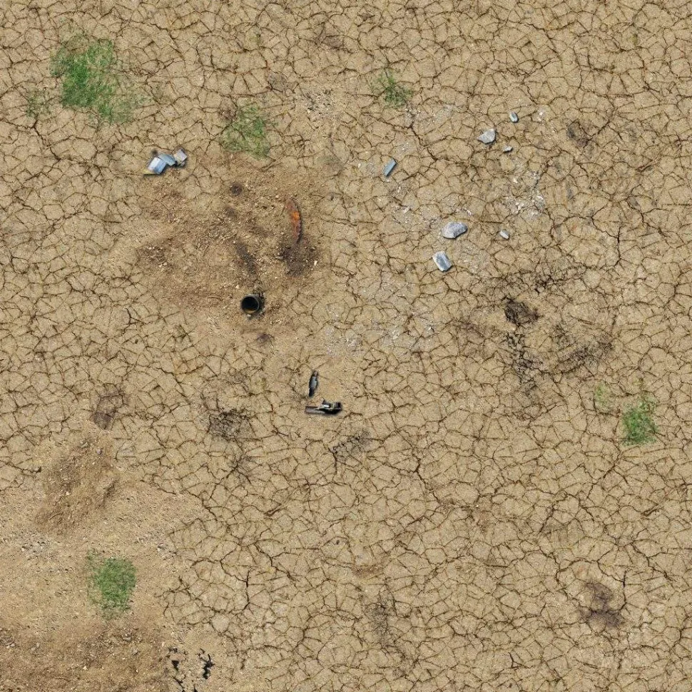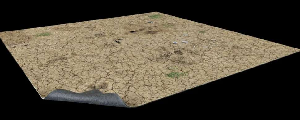This gaming mat depicts a barren desert with cracked earth and scattered debris. It is printed in high quality on fabric with a 1mm neoprene backing. It can be combined with similar mats to make a larger battlefield and can be rolled or folded for easy storage.