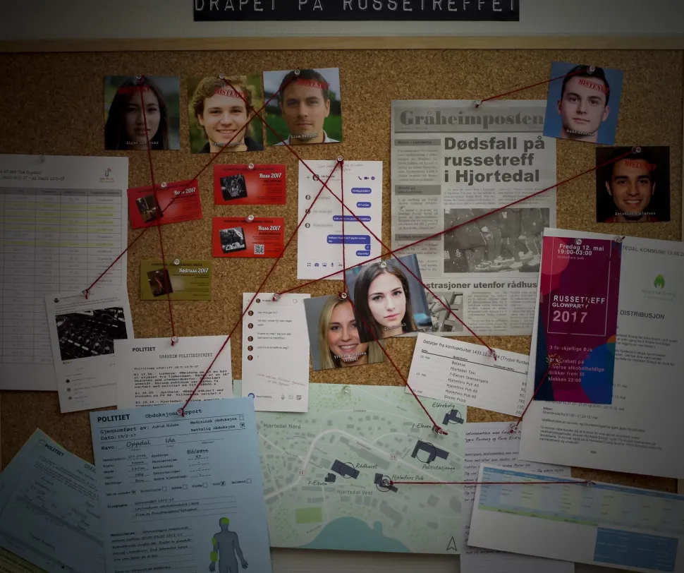 –OVER 40 ULIKE DOKUMENTER.Bevismaterialet forteller en gripende historie hvor hver detalj er viktig. Let gjennom avisutklipp, avhørslogger, vitneutsagn, kart, russekort, bilder, chat-logger, telefonlogger og mye mer. Let også etter ledetråder i overvåkningsvideoer på internett.