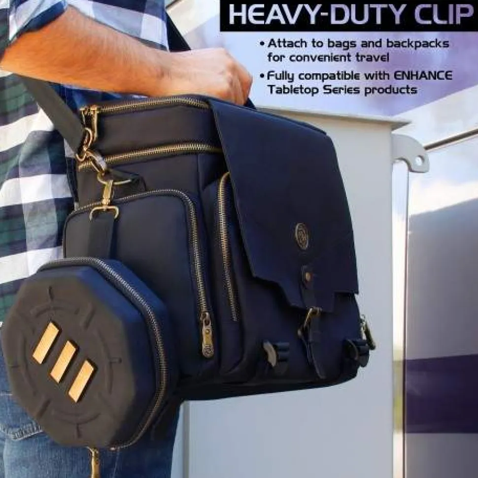 Equipped with heavy duty zippers, scratch-resistant lining, and a large soft-lined dice rolling tray with large wall. The ENHANCE Dice Storage Case is the perfect addition to your collection of RPG travel accessories. It is actually two products in one, with one half safely storing up to 150 dice and the other functioning as a large dice tray that can be passed around the gaming table. A hard shell reinforced case protects your dice from wear and tear, while the soft lined interior keeps all your dice free from blemishes and unsightly scratches. It also features a metal attachment clip for attaching to backpacks and bags. Our Dice Travel Case is great for Dungeons and Dragons, board games, and various other tabletop RPG games. Replace your small dnd dice bags and bulky dice trays with the ENHANCE Dice Case, a solution for all RPG players.