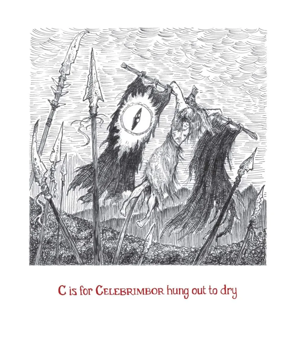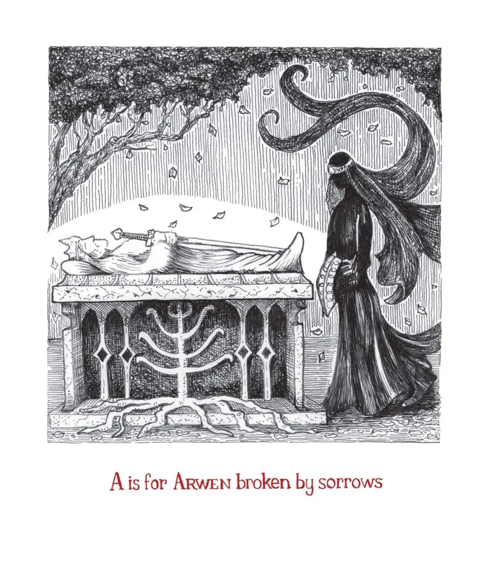 J.R.R. Tolkien’s The Lord of the Rings meets Edward Gorey’s The Gashlycrumb Tinies in this darkly satirical illustrated parody of the Tolkien universe: ‘A is for Arwen broken by sorrows; B is for Boromir punctured by arrows. C is for Celebrimbor hung out to dry; D is for Denethor…’