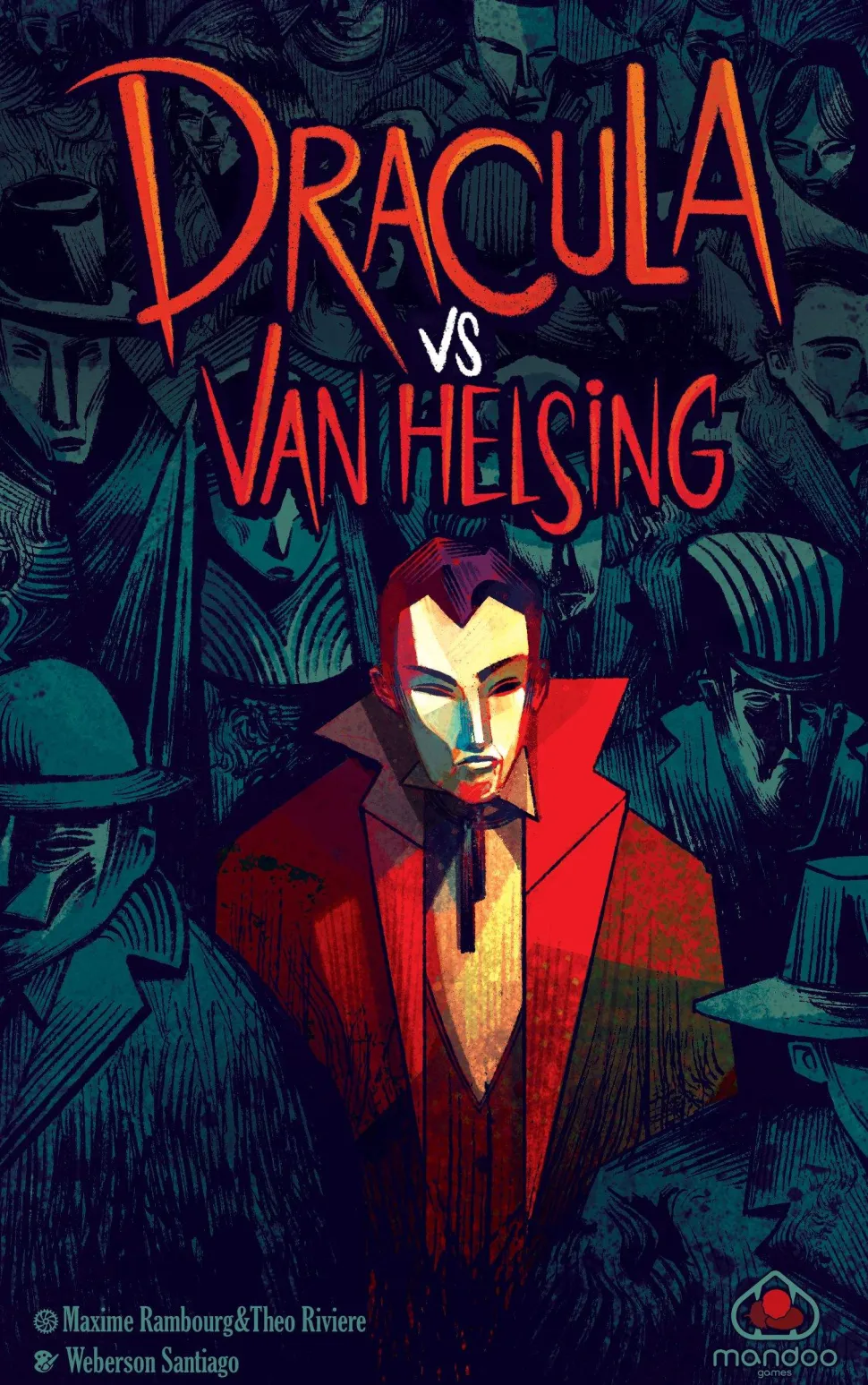 Many years after the confrontation with Van Helsing, Dracula landed in Whitby, England once again. The citizens of Whitby sought help from the vampire hunter, Professor Van Helsing. Will Van Helsing defeat Dracula before he transforms all the inhabitants into vampires?In Dracula vs Van Helsing, each player controls one of the title characters. Van Helsing must remove all of Dracula’s life points to win, but if Dracula turns all four inhabitants of the same district into vampires first, Dracula wins.The game lasts at most five rounds. Each round, players play in turn (starting with Dracula), drawing a card, then discarding that card or swapping it with one of the five cards on their rack to trigger the discarded card’s ability. Cards come in eight types, each with its own effect. Instead of drawing (and discarding) a card, a player can call for the end of the round. In order to choose this action, at least six cards need to be in the discard pile. After the opponent plays one last turn, the round ends; otherwise, the round ends when the deck is empty.At the end of a round, players compare the five cards on their rack. Each card corresponds to one of the five districts on the game board. If Dracula has the higher-valued card, one of the humans in this district is converted into a vampire; if Van Helsing is higher, Dracula loses a health point. If one of the game-winning conditions is met, the game ends immediately.—description from the publisher