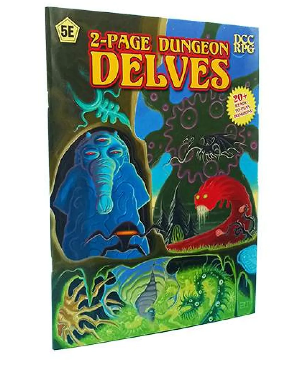 This companion piece is a compilation of over 20 two-page adventures set in a wide variety of environments for variable character levels. Each Delve is exactly two pages long and features one or more monsters fromDungeon Denizens, a map, an illustration, and 3 to 5 encounter areas. These dungeons are perfect for one session of play. This book is system neutral and can be used for your5EorDCCRPGgame, along with a copy ofDungeon Denizens.