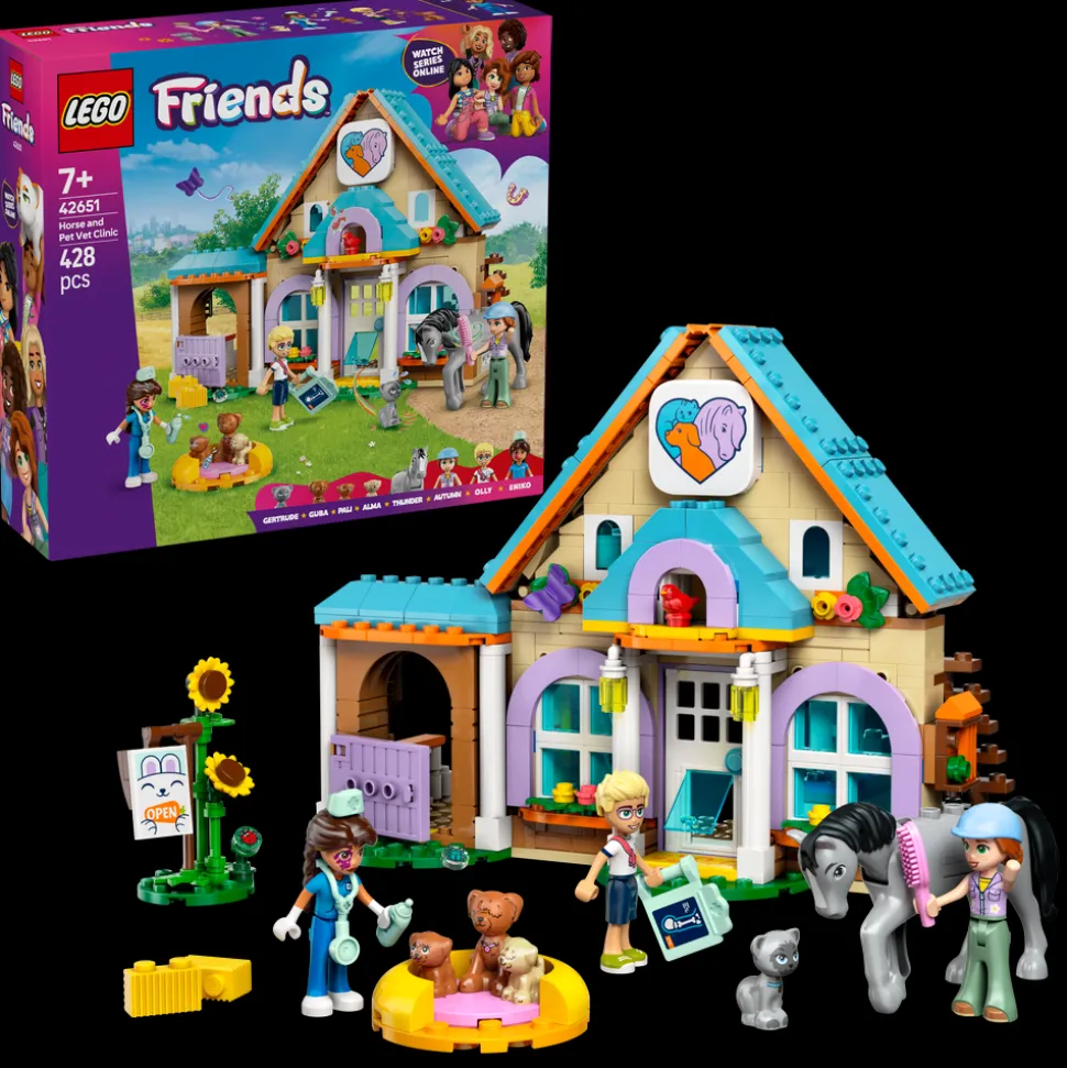 - Late som-lek for dyrevenner – settet Dyreklinikk med hest og kjæledyr for jenter, gutter og dyrevenner fra sju år inneholder tre LEGO® Friends minidukker samt figurer av en hest, tre hunder og en katt