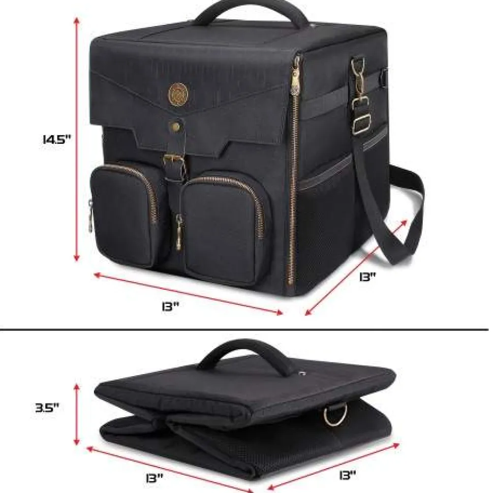 ENHANCE Tabletop Game Box Shoulder Bag- Innovative folding design allows you to flatten the bag for storage when not in use.-The front pockets can hold cards and dice or other small accessories.-The main compartment with full access opening fits 12×12 -game boxes.-Reinforced padded sides keep your games protected and pristine.-Side pockets with straps allow you to carry larger rolled maps and game boards. Pockets can also hold drinks, pens pads and other small accessories.-The bag itself is made with durable woven materials, weather resistant bottom and heavy-duty metal hardware. The metal ENHANCE metal badge, PU leather buckles and patterned material provide a gaming inspired stylish look.Exterior dimensions folded: 13 x 13 x 3.5 inchesExterior dimensions expanded: 14.5 x 13 x 13 inchesInternal dimensions: 12.5 x 12.5 x 12.5 inches