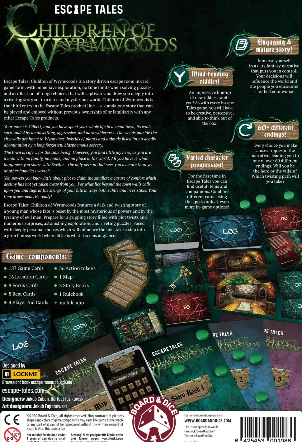 Escape Tales: Children of Wyrmwood er et “escape room” i kortform, med en drivende historie som bakgrunn. Spillet legger mye vekt på utforsking, har ingen tidsbegrensning når dere løser gåter og inneholder en kolleksjon av tøffe valg som drar dere dypere inn i historien til denne mørke og mystiske verdenen. Children of Wyrmwood er en utvidelse til Escape Tales spillene, men krever lite til ingen tidligere kunnskap om grunnspillet. Alt man trenger, og en fullstendig og god fortelling, får man i The Children of Wyrmwood. Dette spillet inneholder nye ting i Escape Tales serien: – Flere kort med enda flere gåter – Et karakterutviklings system basert på valg – En original og mørk fantasy setting, tidligere utilgjengelig i serien – En kompleks historie hvor du bestemmer veien historien skal gå – En ny kategori med kort: brukbare ting som hjelper deg på din vei mot mørkheten Spillet varer i 450 min og er for 1-4 spillere. Aldergrense 16+