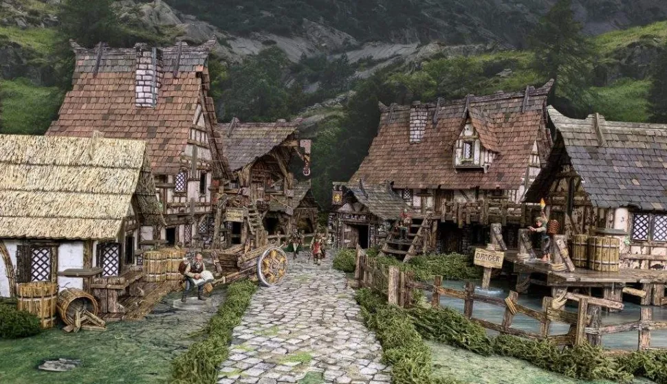 This box contains all the terrain you need for a complete gaming table in a quaint village setting, suitable for many 28-35mm fantasy and historical games. You can tightly pack the terrain into a small skirmish board or spread it out over a larger table. Many of the pieces are modular and can be assembled in any combination you choose for a different set-up every time. The roofs are removable and the buildings have fully detailed interiors.