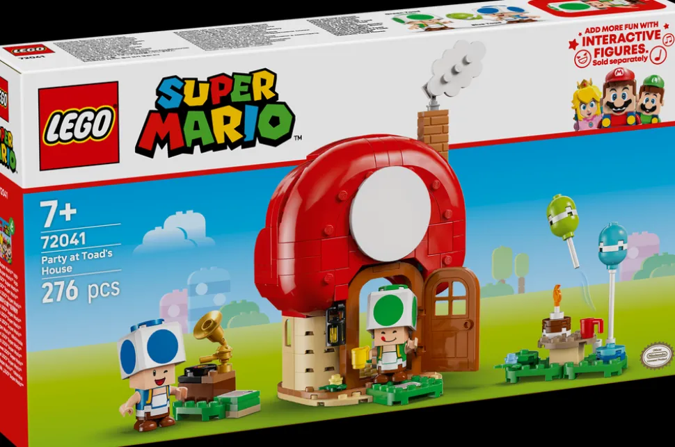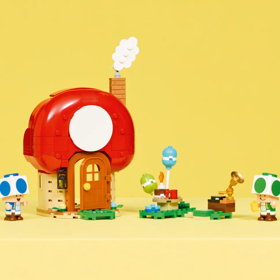 - Nå er det fest – Toad-huset rommer kjøkken og soverom (med et veggmaleri av slottet til Peach) og møbler som kan flyttes på, og settet inkluderer også et piknikbord, en platespiller og festtilbehør