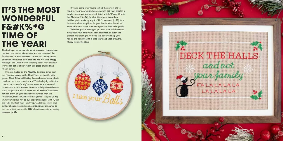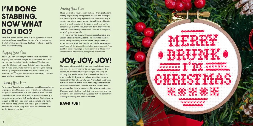 There is no previous experience required here! In addition to simple instructions and clear, easy-to-follow patterns, you get a basic lesson in cross-stitch technique, so anyone can make these designs. Stitch your stress away with a little “Hello Drunk, I’m Christmas” for your tree, or make a “Deck the Halls and Not Your Family” for your sibling.