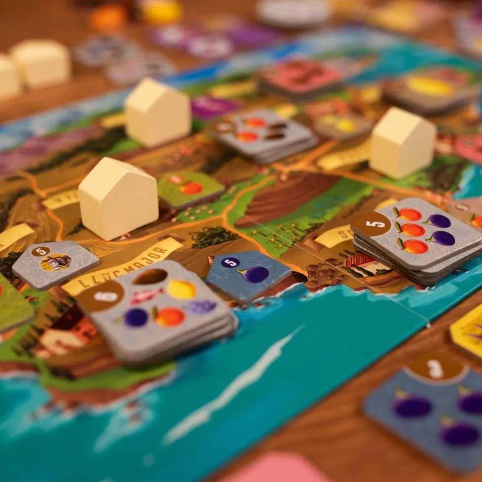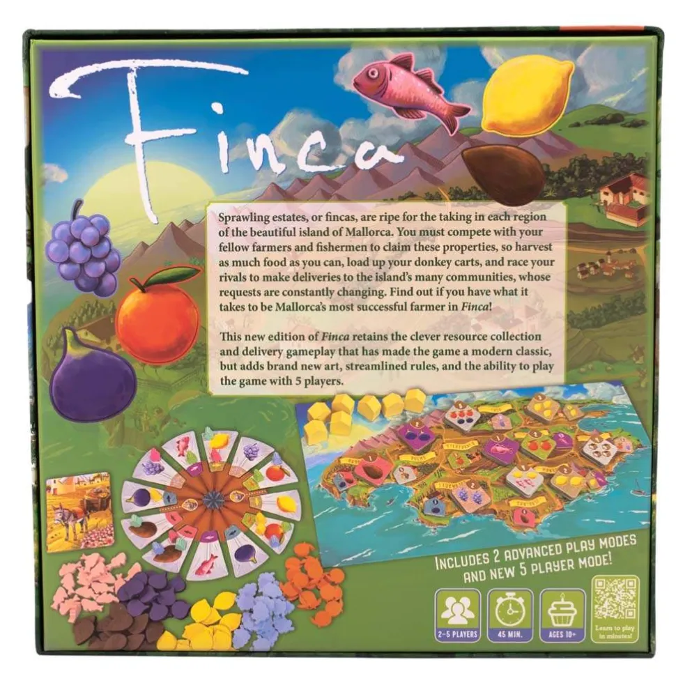 The gameboard of Finca shows the mediterranean island of Mallorca. Players try to crop and deliver the fruits of Mallorca (such as oranges, lemons, almonds, grapes etc.) by means of moving workers on a traditional windmill. Object of the game is to distribute your crop as effectively as possible in order to deliver faster than your opponents.From the Box: Mallorca, Island of the Wind. A place of golden beaches and a light-blue sea. The almond harvest is at hand, in addition, juicy oranges, lemons, and figs are ready to be picked and taken to the market. Olive trees bewitch the country with their curled branches and sumptuous vineyards invite passers-by to walk among their warm earth. In the midst of this landscape, your centuries-old natural stone farmhouse provides a home and supports your large windmill: your FINCA.Listen to the wind, which propels your windmill! Then take in the course of the yearly harvest the sweetest and most valuable fruits from the land. Load them on your old donkey cart and travel around the island, selling them everywhere. If you manage this quickly, you will soon be the richest farmer on the island.Note: The Pandasaurus Games edition from 2024 plays up to 5 players while earlier editions play up to 4.Recommendations: 2011 Hungarian Boardgame Prize Winner 2011 Ludoteca Ideale (Italy) Nominee «Spiel des Jahres 2009» 4th place «Deutscher Spielepreis 2009» Nominee «Graf Ludo 2009» Adult Game of the year 2010 (Finland)