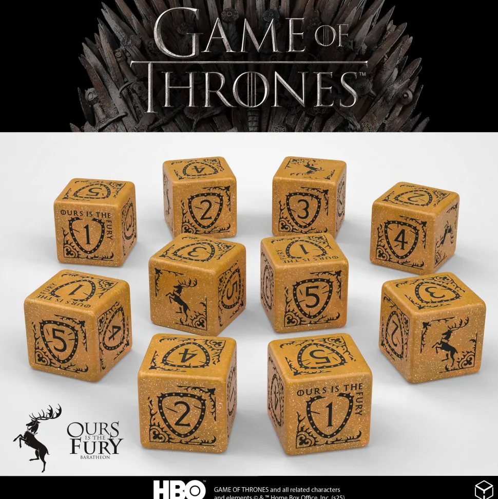 This officially licensed dice set embodies the storm-forged might of House Baratheon, with shimmering yellow dice and black engravings that echo its sigil. Each die bears the crowned stag on the highest face and the rallying cry, «Ours is the Fury,» on the lowest. A bold and striking set, made for those who thrive in battle and claim what is rightfully theirs.