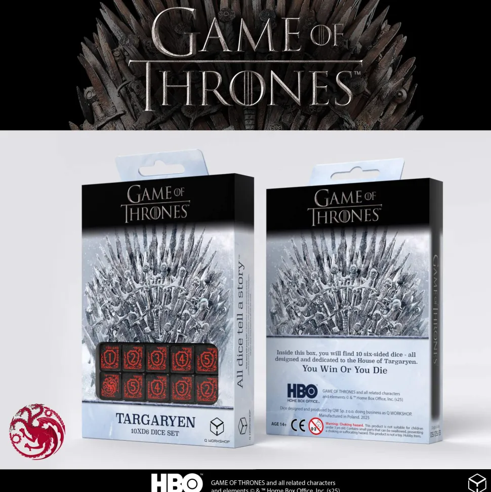 House Targaryen – The highest value faces of each dice feature the three-headed dragon as the Targaryen sigil, while the lowest face is adorned with its motto, “Fire and Blood.”
