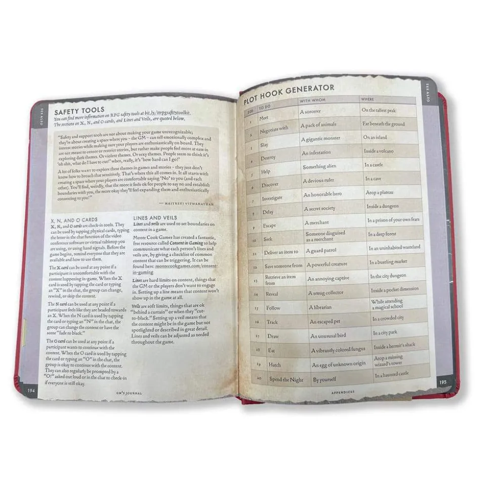 This A5-sized (5.8″ x 8.3″) journal is almost 200 pages for you to keep your plans, record your notes, and manage your adventure. There are sections for tracking magic items, roleplaying bonuses, great moments, embarrassing defeats, and even who still owes you for pizza.