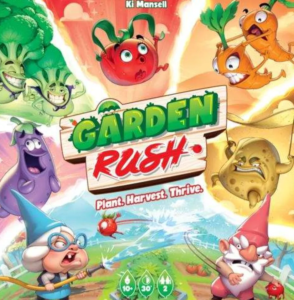 Garden Rush is a two-player, tile-placement battle game in a vegetable garden in which players race to grow vegetables in their garden and fill their basket before their neighbor. Careful planning is needed to plant each vegetable in its unique pattern for future harvesting, while keeping an eye on the conveyor belt shared between the gardens.Players place one tile per turn to build their garden, following the harvesting patterns for each vegetable. Extra abilities, including Take That options, can be gained by using special tiles on the board or on the scoring track. The first player to reach 40 points or who has the highest score when the tiles run out, wins.