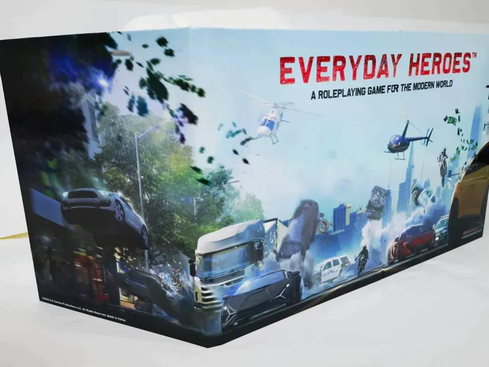 This 4-panel Gamemaster Screen gives you easy access to the key tables and rules needed to run any Everyday Heroes adventure. The artwork is by Lorenzo de Sanctis, the lead illustrator for the Need for Speed video game series.