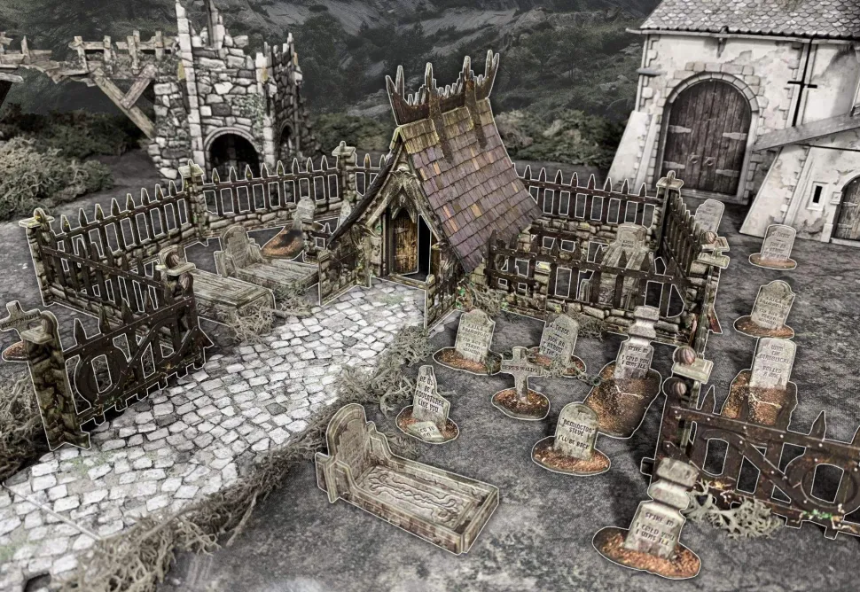 This pack upgrades your gaming table with a spooky graveyard. It includes an imposing central mausoleum, wrought iron fencing, and a variety of headstones, sarcophagi and useful scatter terrain to add immersion to your board. The pieces are compatible with the rest of the Battle Systems Fantasy range.