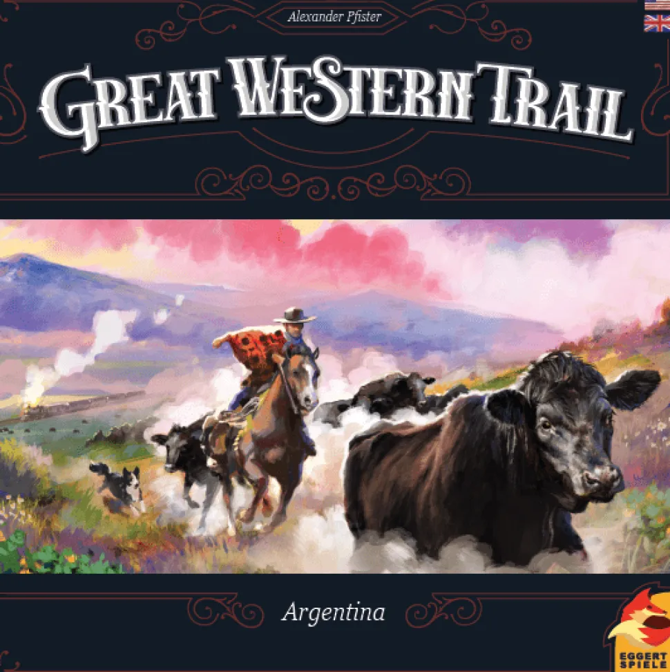In Great Western Trail: Argentina, you own a vast estancia in Argentina at the end of the 19th century, and you will need to travel the plains of the Pampas with your cattle to deliver them to the main train station in Buenos Aires.Great Western Trail: Argentina features gameplay elements similar to Great Western Trail such as deck management, the rondel mechanism, and the ability to upgrade your player board, along with twists on these elements and new features.The player board features a new type of worker — farmers — and different paths await on the game board to confront you with more choices. Will you take the road with buildings or a path past farmers? Maybe you’ll have the chance to use your cows — well, the strength on your cow cards — to help farmers, getting them on your side and adding grain, a new type of resource, to your income, with grain being used for boat and city tiles.Perhaps you can unlock shortcuts that allow you to deliver your herd to Buenos Aires more quickly. Sure, you’ll forfeit the use of action buildings, but maybe you can catch others unaware, with the ships leaving before they deliver. The timing of reaching the central train station to deliver your herd has never been so crucial, and valuable bonuses await on the city’s port tiles.Money is easier to get in Great Western Trail: Argentina, but you have more to manage in terms of action options, shortcuts, and cards (including the new exhaustion cards), so the challenges won’t let up.Great Western Trail: Argentina also includes a solitaire challenge in which Pedro is waiting for you to try to beat his score.