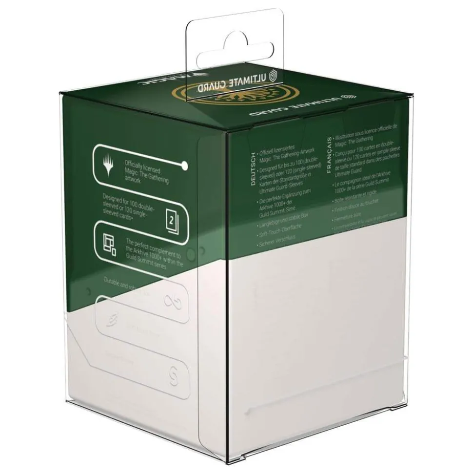 Ultimate Guard celebrates one of the most iconic and popular planes in Magic: The Gathering’s history with the «Guild Summit» series: Ten elegant Boulder 100+ featuring the golden crest of each guild on the semi-transparent deck boxes, all with a silky soft-touch finish. The Boulder 100+ holds up to 100 double-sleeved cards, making it the perfect home for your two-color Commander deck! Don’t miss out on the stunning Arkhive 1000+ Xenoskin from the «Guild Summit» series either, which is the perfect storage place for up to ten Boulder 100+.