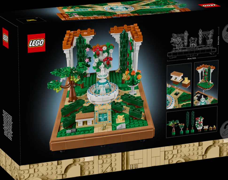 - Hva inneholder esken? LEGO® Hage med fontene inkluderer et springvann i flere etasjer, lavabo, to sypresser, blomstrende vinranker, fire pergolaer og hellelagte stier samt figurer av månespinner, fugl og frosk