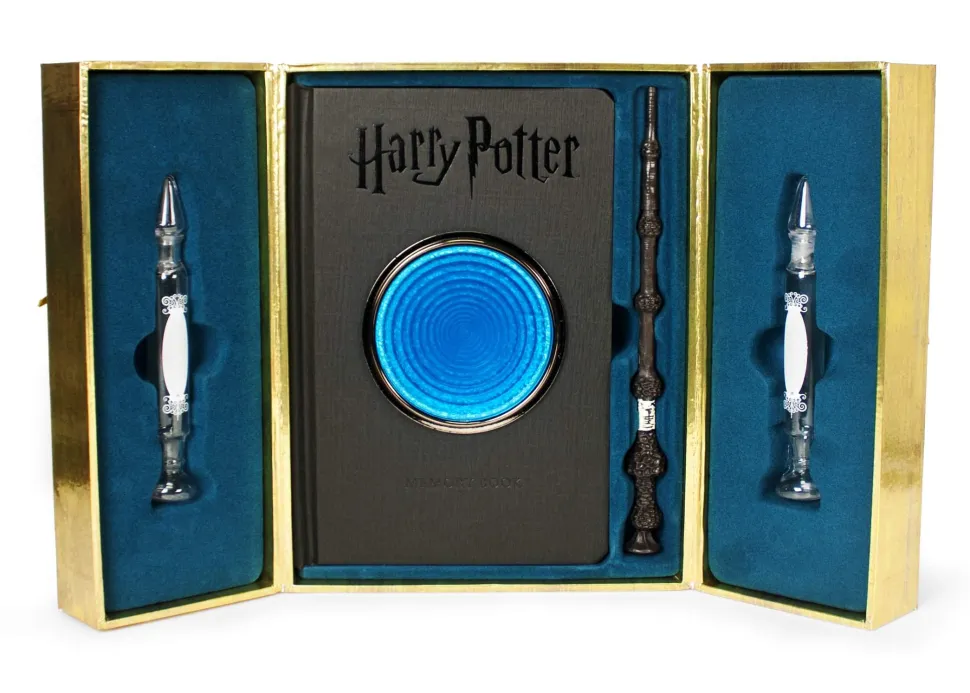 A journal with embedded pensieve, Dumbledore wand pen, memory vials, and keepsake box allow you to create a one-of-a-kind experience inspired by the world of Harry Potter. Set includes: