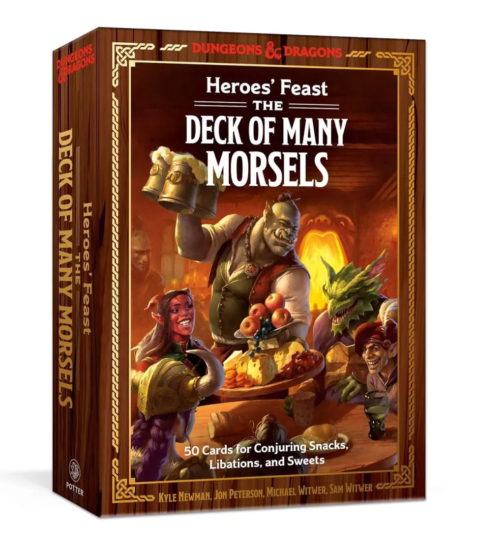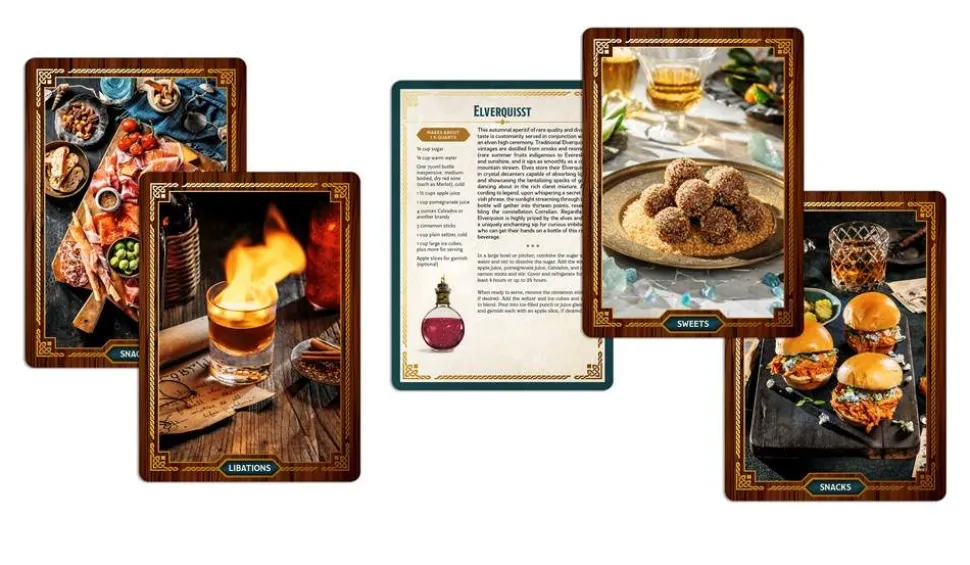 This oversize deck of 50 cards with photographs brings to life festive foods and drinks that span the vast multiverse of Dungeons & Dragons—culled from the menus of taverns and markets to the recipe books of halflings and night hags. Just pick a card, use it as a shopping list at the store, and then reference the photograph on the front while you follow the heroically simple steps on the back.