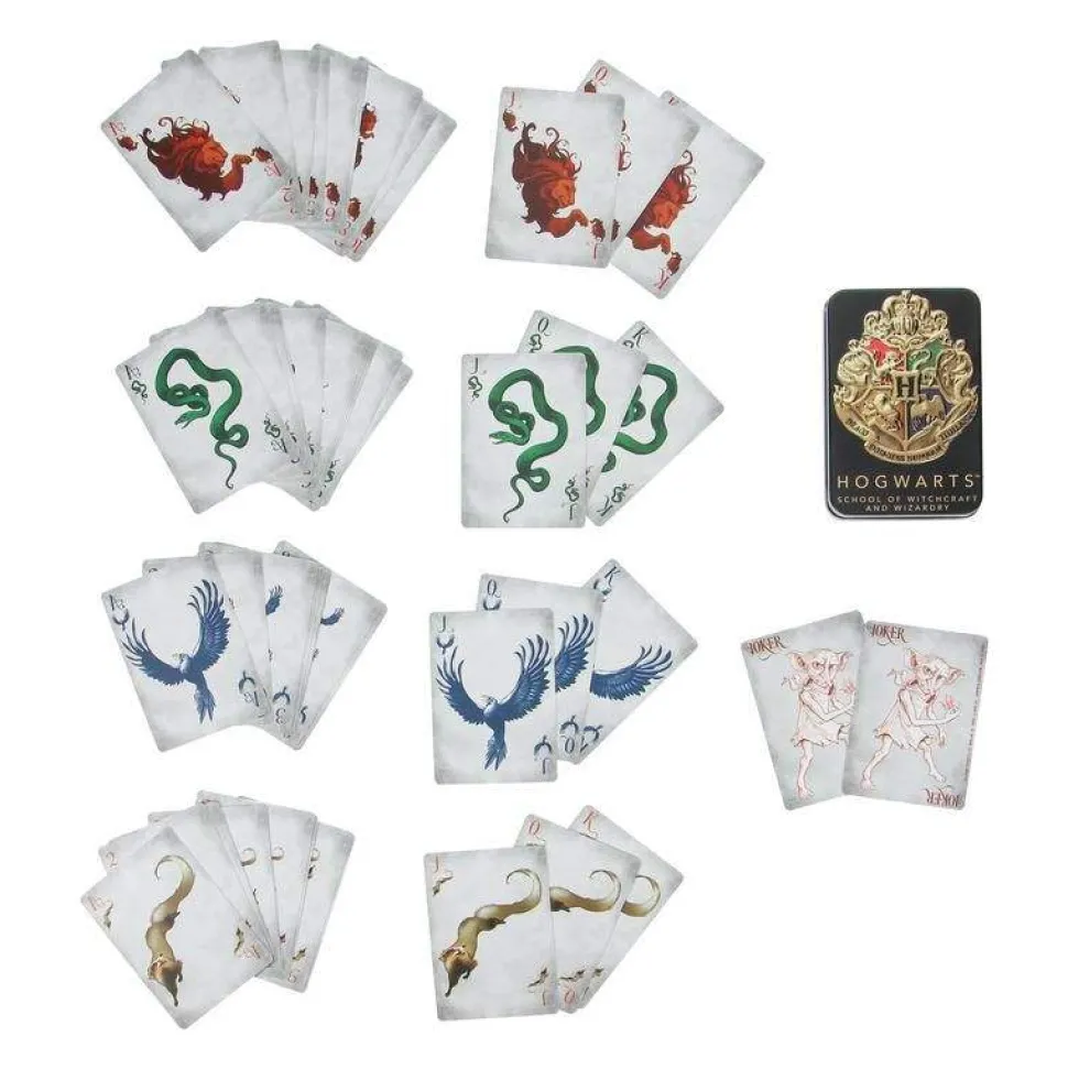 Deal in magic with this set of Hogwarts Playing Cards.Inspired by the four houses of Hogwarts School of Witchcraft and Wizardry, the 54 card deck features suits in the designs of Gryffindor, Hufflepuff, Ravenclaw, and Slytherin.The set comes in a metal embossed black tin, complete with the iconic crest of Hogwarts.The Hogwarts Playing Cards are great for putting a magical spin on classic card games.Inspired by the Hogwarts housesStandard deck of 54 cards including two jokersIncludes embossed metal storage tinOfficially licensed Harry Potter product