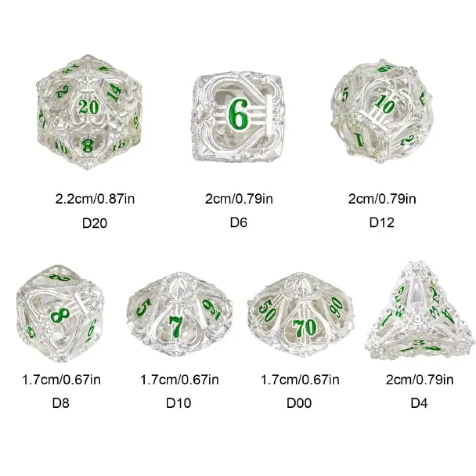 Et sett med syv forskjellige terninger, som passer til rollespill. Inkluderer: D4, D6, D8, D10, D12, D20 og en prosentterning.