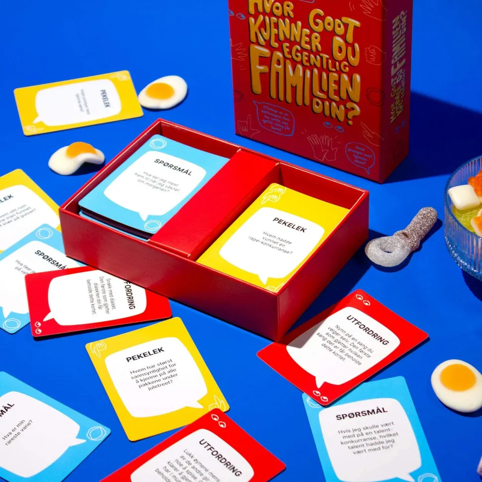 Utfordringer: Spinnville utfordringer som vil føre til utallige latterkramper. Spørsmål: Morsomme spørsmål som gjør at dere blir bedre kjent. Pekelek: Stem på hvem som kunne ha gjort hva i familien!