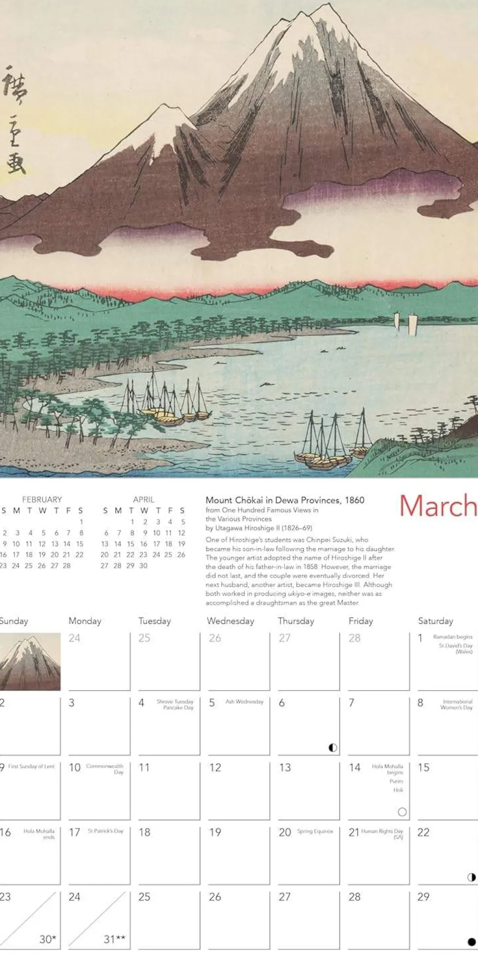 This calendar is filled with a visually dazzling array of woodblock prints from masterful Japanese artists Hiroshige I and II. The artworks feature dramatic rocky cliffs, natural beauty and mountainous landscapes, all created in a mesmerizing style and displayed with vibrant colours. In this mini calendar, informative text accompanies each work and the datepad features previous and next month’s views. Printed on FSC-certified paper, with plastic-free packaging.