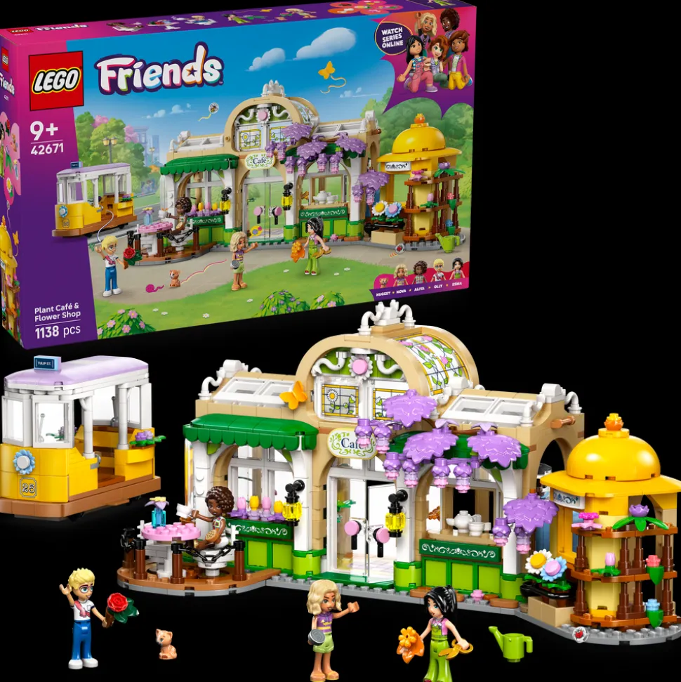 Dette settet rommer et vell av blomster og planter, og barn kan finne på historier om Aliya, Olly, Nova, Esma og katten Nugget, som alle elsker å samles både i butikken og på kafeen. Settet inneholder mange detaljer som inspirerer barn til å finne på kreative fortellinger, inkludert en kjempesøt trikk som figurene kan sitte på med, og en kafé med uteservering og kjøkken med kaffemaskin. Det står også blomster og potteplanter som er til salgs, i et stativ utenfor. Når leken er over, kan barn glede seg over det flotte blomstersettet ved å stille ut modellen på en hylle eller et bord.