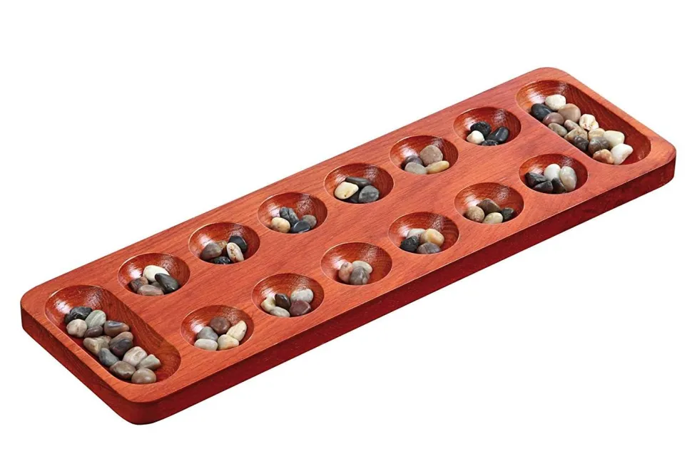 The game is played on a board of two rows, each consisting of six round pits. The rows have a large store at either end called kalah. A player owns the six pits closest to him and the kalah on his right side. Beginners may start with 3 seeds in each pit, but the game becomes more and more challenging by starting with 4, 5 or up to 6 seeds in each pit. Today, 4 seeds per pit has become the most common variant, but Champion recommended the expert game with 6.
