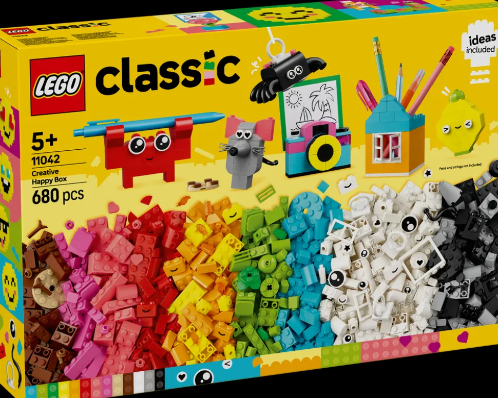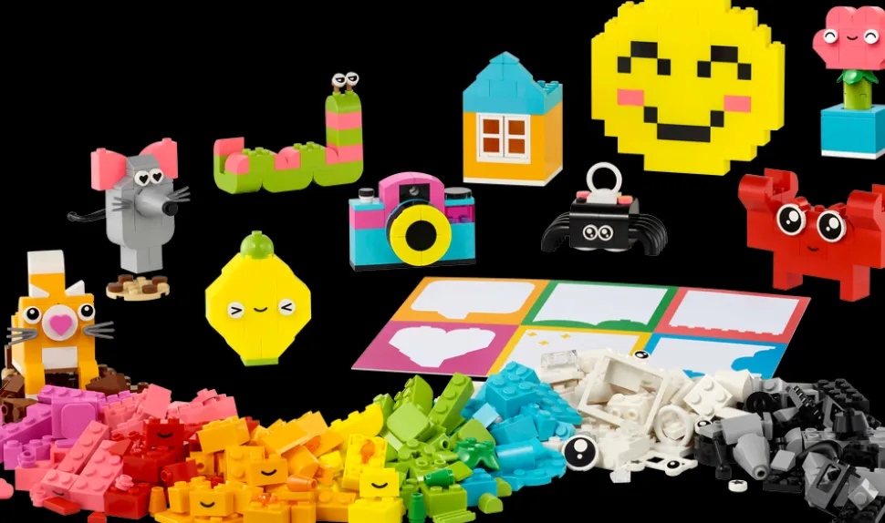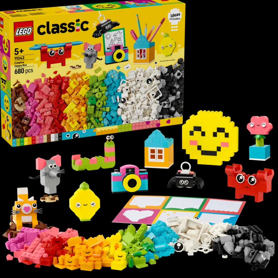 Settet Kreativ lykkeboks inkluderer forslag til ti lettbygde modeller som hver er laget for å spre glede. Barn kan bygge om modellene til 12 nye leker og deretter bruke fantasien og bygge dem om så mange ganger de vil. På den måten kan de dekorere rommet sitt med gøyale og nyttige gjenstander som de har laget selv. Edderkopp-, bie- og fugleleken har opphengselementer, mens krabben, apen og huset kan brukes som holder for små objekter som en blyant eller en tannbørste. Blomst-, kamera-, markørpenn-, hjerte- og kaktusmodellene har et klipselement som barn kan bruke for å feste en lapp, et kort eller et bilde (fargepapir følger med i settet). Settet inneholder også andre modeller, inkludert en katt, mus, sitron, mark og et smilefjes. Spre glede med gøyale og nyttige modeller som stimulerer barns kreativitet.