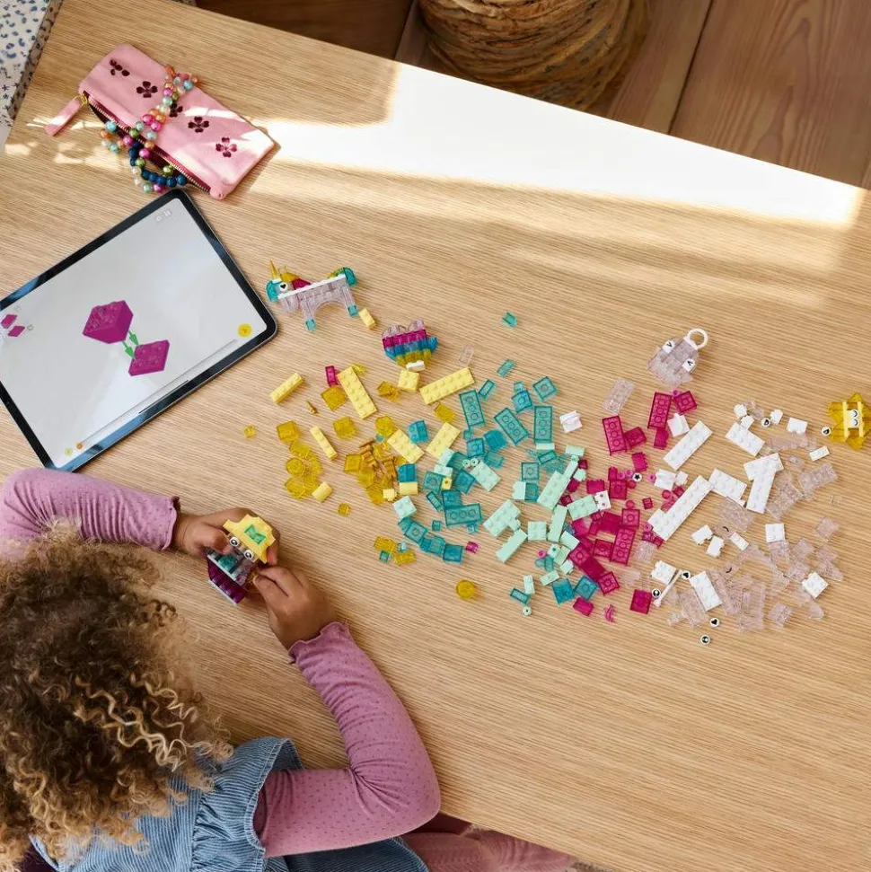 - Kreativt byggesett – gjennomsiktige klosser, øye- og munnelementer og opphengsklosser for utstilling gjør barns kreative kreasjoner ekstra gøyale og glitrende