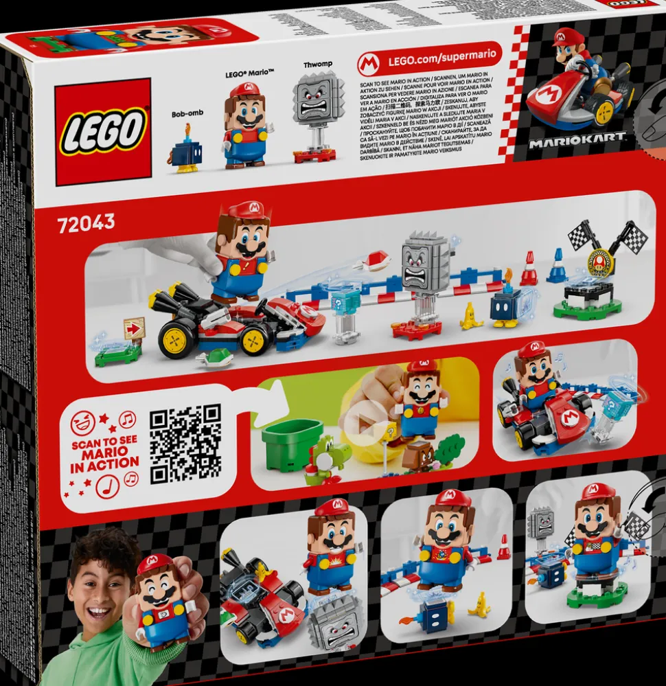 Med dette klossebygde Mario Kart™ lekesettet (72043) kan barn lage sin egen racerbane og arrangere interaktive løp med LEGO® Mario™ i sin Standard Kart. Byggesettet er en fantastisk LEGO® Super Mario™ gave for jenter, gutter og gamere fra sju år. Barn får gøyale billøp og late som-lek med settet som inneholder en interaktiv LEGO Mario lekefigur og en Standard Kart som kan brukes til actionfylt drifting, og en funksjon for skjellskyting. Bygg en racerbane med startområde, banehindere som kan kobles sammen, trafikkjegler og et vinnerområde. Kjør Standard Kart med LEGO Mario for å aktivere lyder og visuelle effekter fra Mario Kart, tjene digitale belønninger fra Item Box, seire over Bob-omb og Thwomp og se hvordan LEGO Mario reagerer på de grønne og røde LEGO platene.