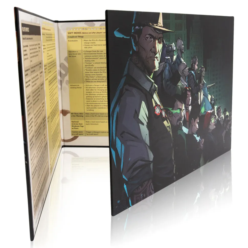 This three-panel landscape illustrated MC (GM) screen, featuring signature City of Mist exterior art by Marcin Sobon, contains summarized rules for quick reference, status and MC moves suggestions, and narration tips for creating a captivating ‘noir’ atmosphere.
