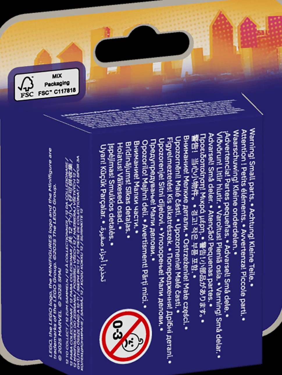 Hver eske inneholder én hemmelig, byggbar Spider-Man-minifigurleke av til sammen tolv samlerfigurer: Miles Morales/Spider-Man, Miguel O’Hara/Spider-Man 2099, Gwen Stacy/Spider Gwen, Hobie Brown/Spider-Punk, Pavitr Prabhakar/Spider-Man India, Miles G. Morales/Prowler, Peter B. Parker/Spider-Man & May «Mayday» Parker, Margo Kess/Spider-Byte, Peter Parker/Werewolf Spider-Man, Patrick O’Hara/Web-Slinger, Petra Parker/Cyborg Spider-Woman og Charlotte Webber/Sun-Spider. Alle de tolv byggbare LEGO Marvel lekeminifigurene er klare til lek, og hver forseglede overraskelseseske inneholder også minst ett tilbehør og et informasjonshefte for samlere.