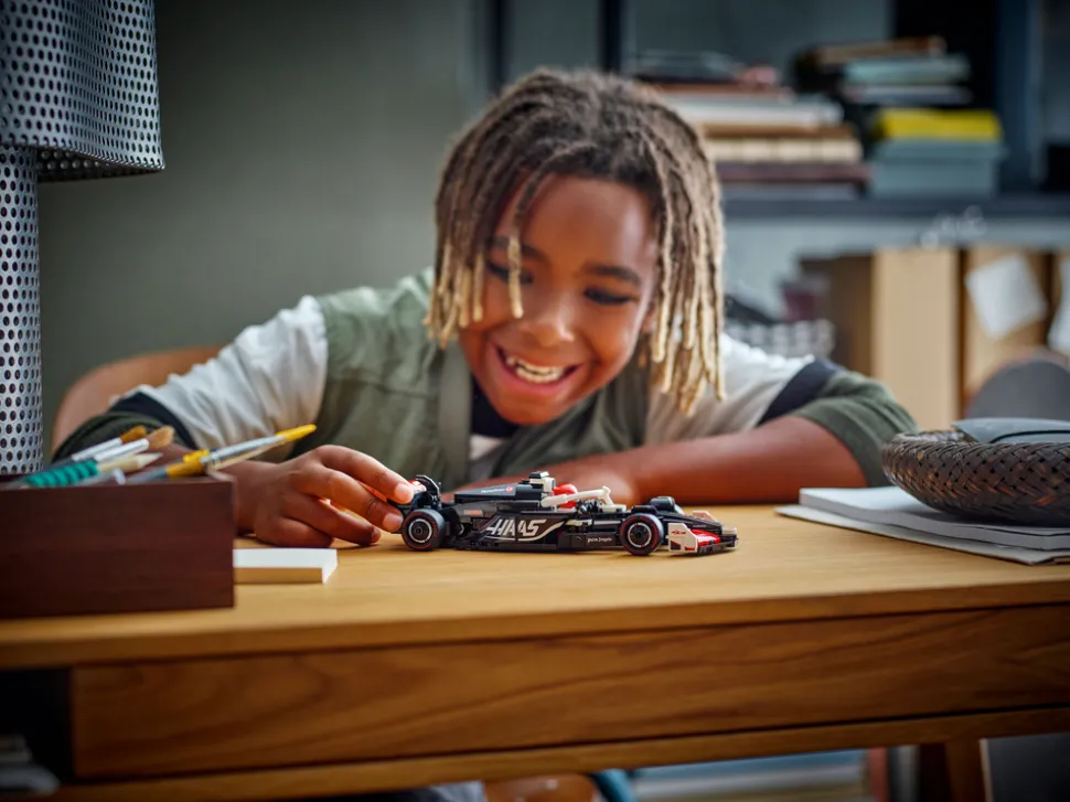 - En minifigur – kjøretøysettet inkluderer en sjåførminifigur med MoneyGram Haas F1®-teamdrakt og hjelm med vinge, som barn kan plassere i førersetet for å arrangere actionfylte billøp