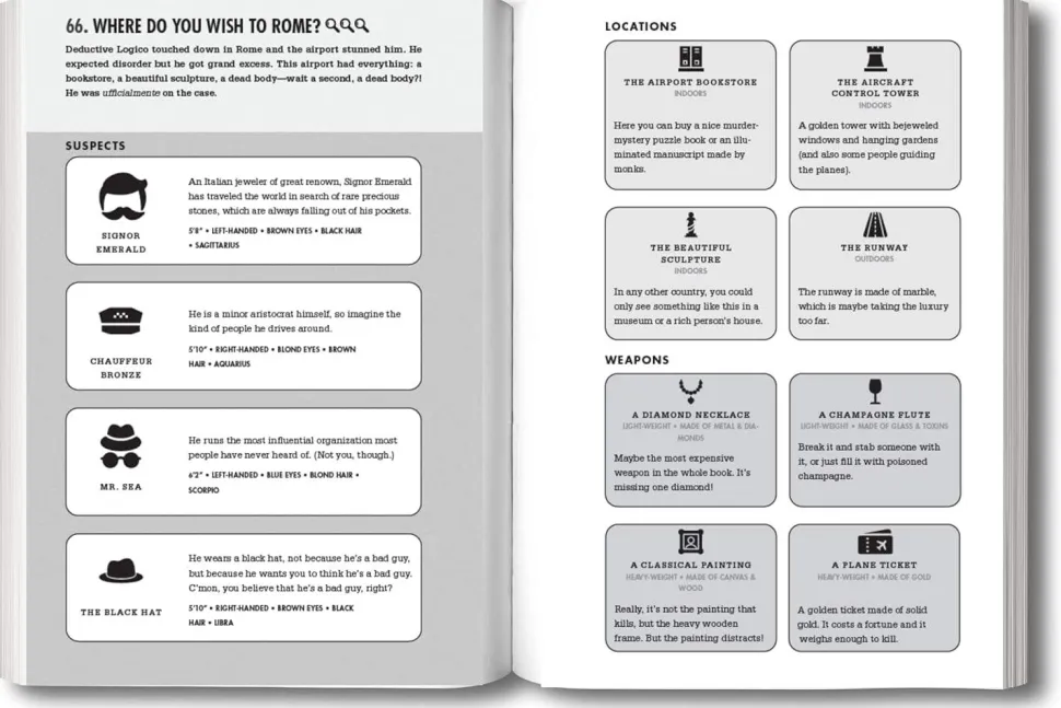 Deductive Logico is ready to kick back and relax on his long-awaited vacation…until a series of murders require his particular expertise in Murdle: Volume 3. Based on the sensational hit online game, these clever and hilarious mini-mystery puzzles will challenge you to find whodunit, how, where, and why. Using your finest skills of deduction to solve each mystery one by one, a greater conspiracy will emerge: Can you uncover the truth behind the (possibly evil) AI supercomputer MORIARTY and expose the secret location of TekTopia before it’s too late?